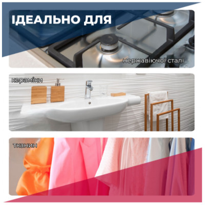 Спосіб застосування Розпиліть засіб на забруднену поверхню й протріть вологою губкою або ганчіркою. Для стійких забруднень залиште на кілька секунд. Для виведення плям на тканинах розпиліть на потрібну ділянку та виперіть у звичайному режимі. На делікатних поверхнях завжди спершу тестуйте засіб на невеликій, непомітній ділянці, щоб переконатися у відсутності зміни кольору та інших пошкоджень. Уникайте тривалого контакту нерозведеного засобу з алюмінієм, пофарбованими або гарячими поверхнями, пластиковими матеріалами та мармуром. Уникайте використання на прозорому пластику, деревині та наклейках. Склад <5% неіонні, катіонні, фосфонатні поверхнево-активні речовини, парфуми, гераніол, цитронелол, лимонен, бензиловий спирт