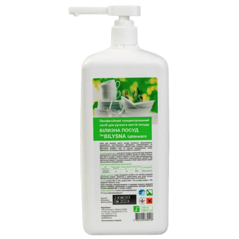 Ефективний і зручний засіб для ручного миття посуду з дозатором. BILYSNA Tableware. Білизна посуд. Побутова хімія для миття сковорідок, каструль, скляного та фаянсового посуду. Концентрований засіб.